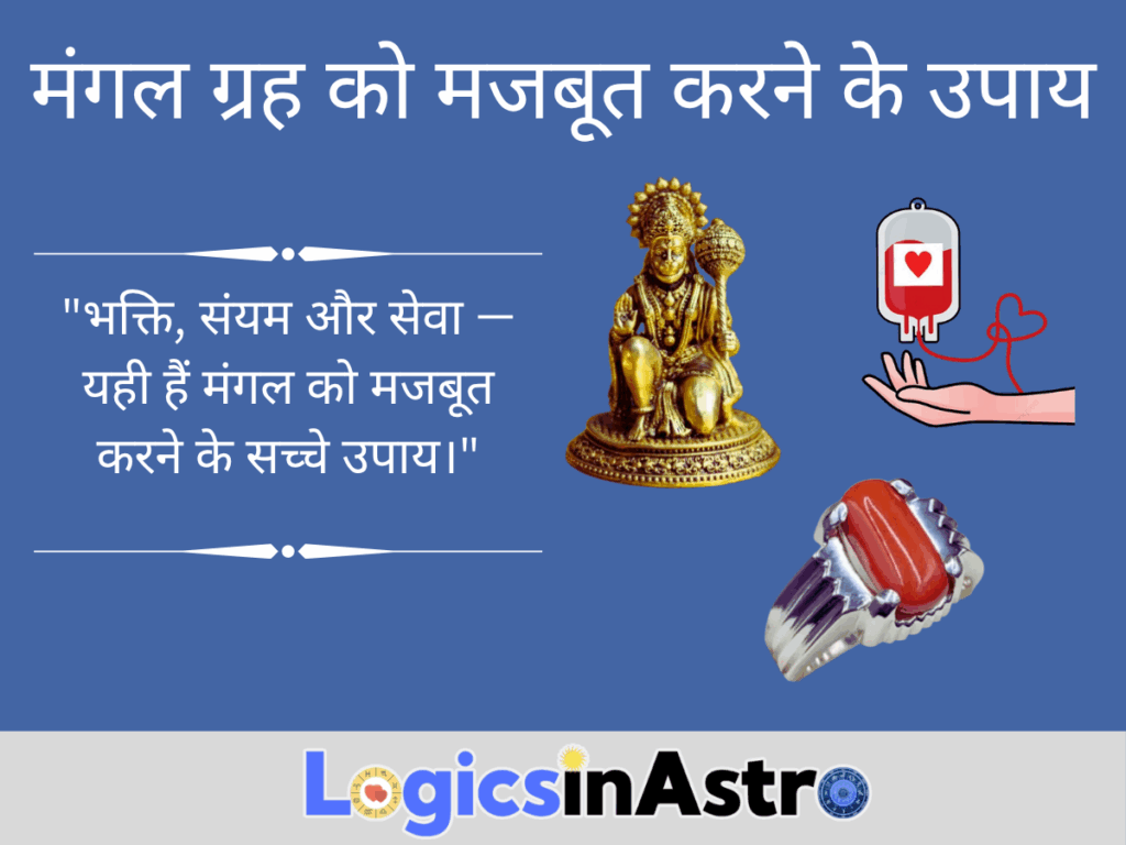 मंगल ग्रह को मजबूत करने के लिए ज्योतिष में कई प्रभावी उपाय बताए गए हैं। मंगलवार के दिन हनुमानजी की पूजा करें, हनुमान चालीसा या बजरंग बाण का पाठ करें। “ॐ अंगारकाय नमः” मंत्र का जाप 108 बार करें। लाल मसूर, गुड़, तांबा या मूंगफली का दान करें। मूंगा रत्न धारण करें (ज्योतिषी की सलाह से) और तांबे के बर्तन में पानी पीएं। इन उपायों से मंगल के दोष कम होकर ग्रह शुभ फल देने लगता है।